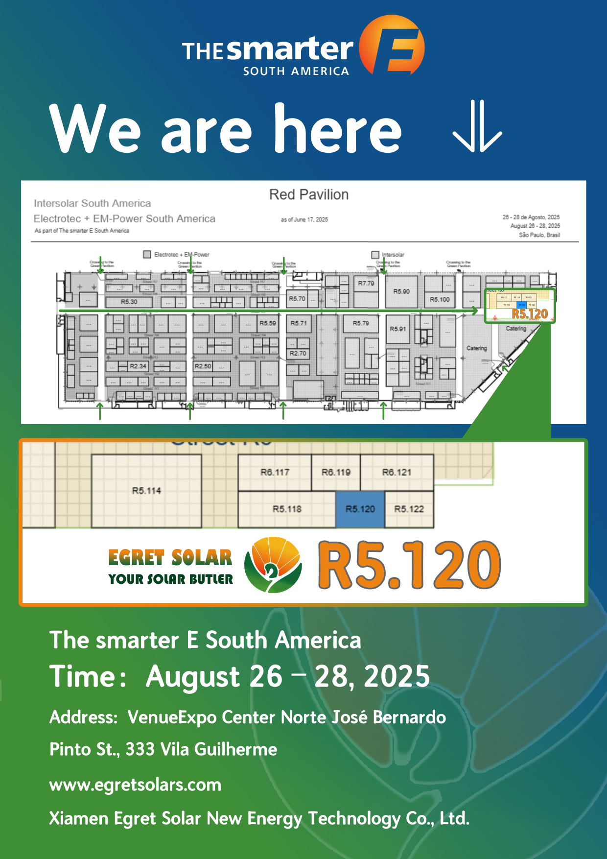 Für weitere Produktdetails oder um einen Termin zu vereinbaren, besuchen Sie bitte unsere offizielle Website: www.egretolars.com. Wir freuen uns darauf, Partner aus allen Lebensbereichen im Smarter E South America 2025 zu treffen, um gemeinsam den blauen Ozean der neuen Energie in Südamerika zu erkunden!