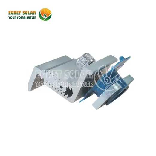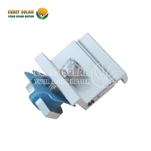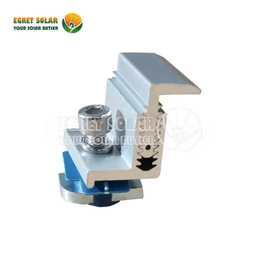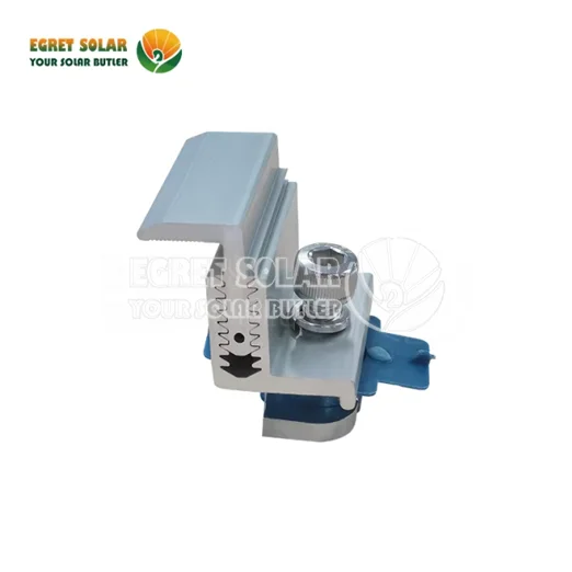 An den Enden von Sonnenkollektoren werden an den Enden von Sonnenkollektoren ein einstellbares EGRET -Endklemm einstellbar, um zu verhindern, dass sie die Befestigungsschienen in starken Wind oder starken Schneelasten abheben. Sie werden auch verwendet, um Sonnenkollektoren an den Montageschienen an den Enden von Solarpanel -Arrays zu sichern. Die Endklemme zieht mit einer Hand für eine einfache, sichere Verbindung an, indem Kabelbindungen durch einen Schlitz in den Platten gezogen werden.